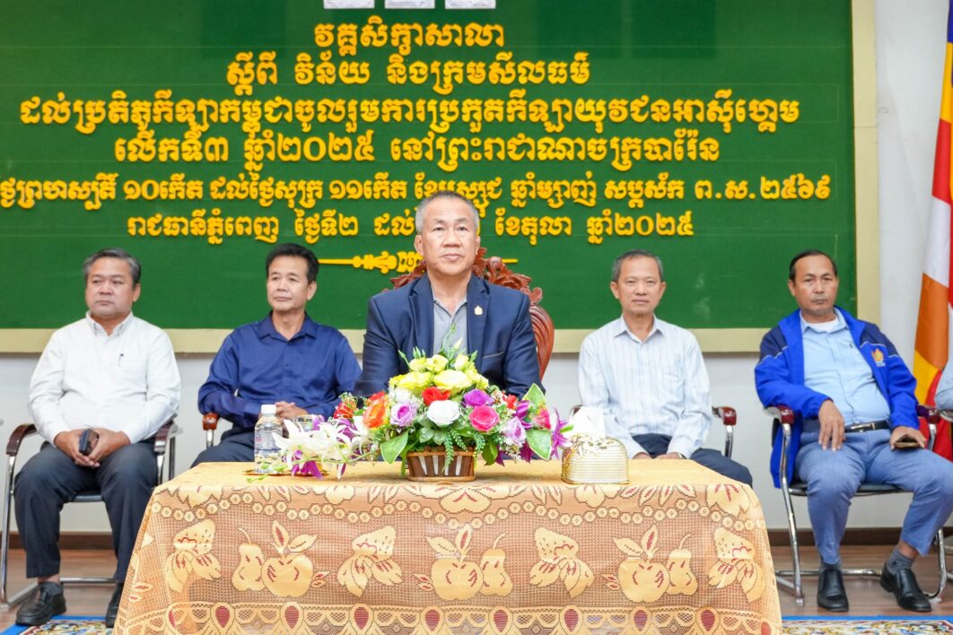 បញ្ជាក់ដែរថា ក្រសួងអប់រំ យុវជន និងកីឡា បានបើកវគ្គសិក្ខាសាលាស្តីពី “វិន័យ និងក្រមសីលធម៌” រយៈពេល ២ថ្ងៃកាលពីថ្ងៃទី២-៣ តុលា ២០២៥។ វគ្គនេះដើម្បីពង្រឹងស្មារតីត្រៀមបញ្ជូនយុវជនកម្ពុជាទៅចូលរួមព្រឹត្តិការណ៍កីឡាយុវជនអាស៊ី លើកទី៣ នៅប្រទេសបារ៉ែន ចាប់ពីថ្ងៃទី២២ ដល់ ទី៣១ ខែតុលា ឆ្នាំ ២០២៥ នៅប្រទេសបារ៉ែន ដែលមានចំនួន ២២៣ វិញ្ញាសា លើ ២៤ប្រភេទកីឡា៕